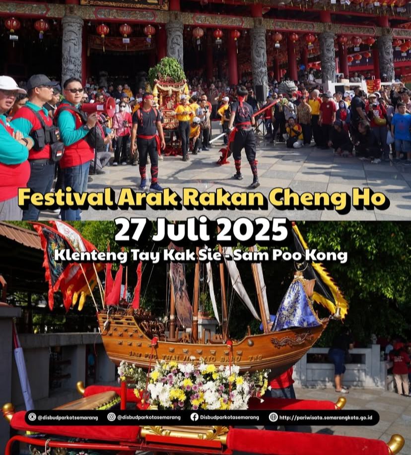 The Cheng Ho Parade Festival is an annual event in Semarang that commemorates Admiral Cheng Ho’s arrival in the city, featuring a cultural procession from Tay Kak Sie Temple to Sam Poo Kong Temple. The festival showcases various cultural attractions, including a parade of deity statues (Kimsin), lion dance performances, dragon dances, and other traditional art performances.